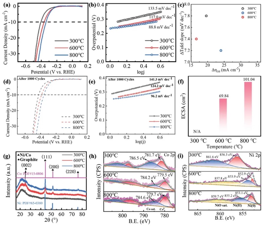 通过在300℃、600℃、800℃下热还原微球,测试其线性扫描伏安曲线、Tafel斜率和电化学表面积,研究热还原温度对催化性能的影响,结果表明800℃还原的微球过电位最低(338.3