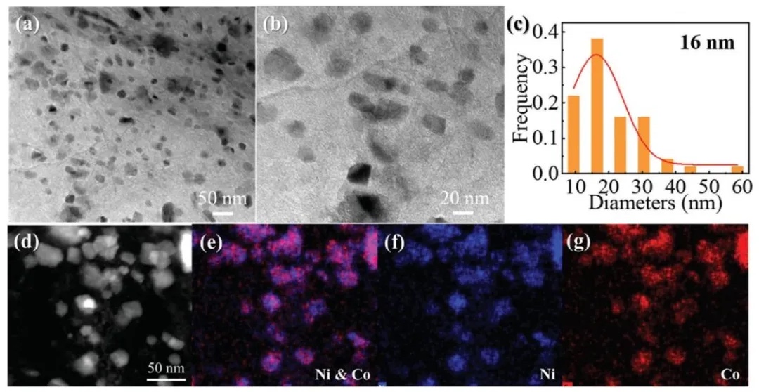 通过透射电镜和元素映射分析3DP rGOAMs-2Ni1Co电极,研究Ni/Co纳米颗粒在石墨烯气凝胶微球中的分布情况,结果表明纳米颗粒直径约16 nm,均匀负载在石墨烯层上,镍和钴元素呈均匀分布状态。