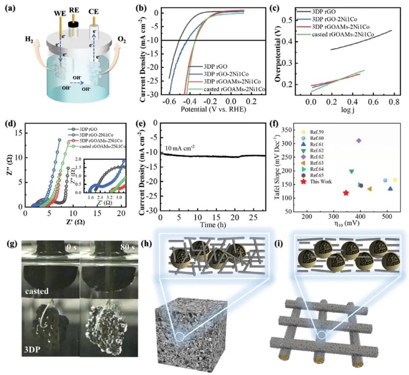 3D打印。所制3D电极在10 mA/cm²时过电位约341 mV,比2D石墨烯3D打印电极降低31.5%,塔菲尔斜率119.1