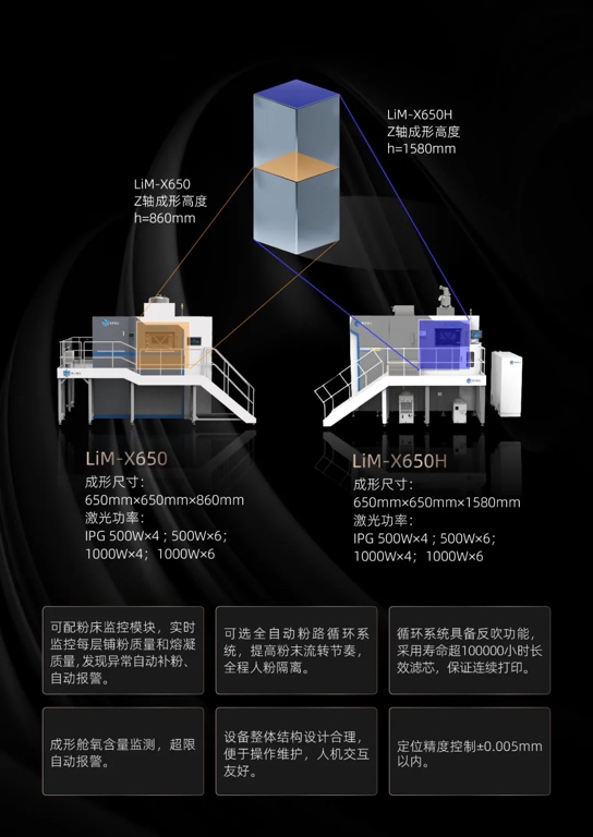 LiM-X650设备多次为用户提供强有力的技术支持,助力项目取得显著成果。参与长八甲火箭芯二级YF-75DA发动机研制工作,充分分析零件结构特点和工艺要求,发挥LiM-X650设备优势,为YF-75DA发动机打印了多种关键零部件。在与蓝箭航天合作的天鹊系列火箭发动机项目中,使用LiM-X650设备生产制造大尺寸、易变形的复杂结构零部件,助力天鹊系列发动机在结构一体化、推力性能提升等方面取得重大进展。LiM-X650H设备Z轴成形高度增至1580mm,采用自主研发的龙门双驱结构设计,提高打印高度的同时控制设备整体高度仅4.5m,具有良好的操作性和维护性。