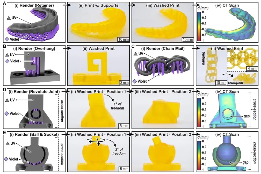 Page教授团队开发了新型多色光响应树脂体系,通过紫外光(UV)和可见光(紫色或蓝色)的选择性照射,分别生成不溶性热固性材料(作为结构主体)和可溶性热塑性材料(作为支撑)。该团队利用丙烯酸酯和环氧基树脂的协同反应,结合微流控技术构建了可溶解支撑体系,实现了在环保溶剂乙酸乙酯中10分钟内快速溶解支撑结构,且表面精度优于传统手动处理。实验验证了该技术在打印钩子、链环、关节等复杂结构中的可行性,显著提升了DLP打印的几何适应性和生产效率。
