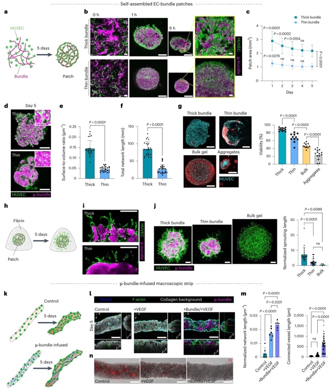 血管生成:厚胶原束(9.5 mg/mL)因高孔隙率促进内皮细胞浸润和血管网络形成,在 VEGF 刺激下生成连通的管腔结构,而薄束(2 mg/mL)因过度压缩效果较差。