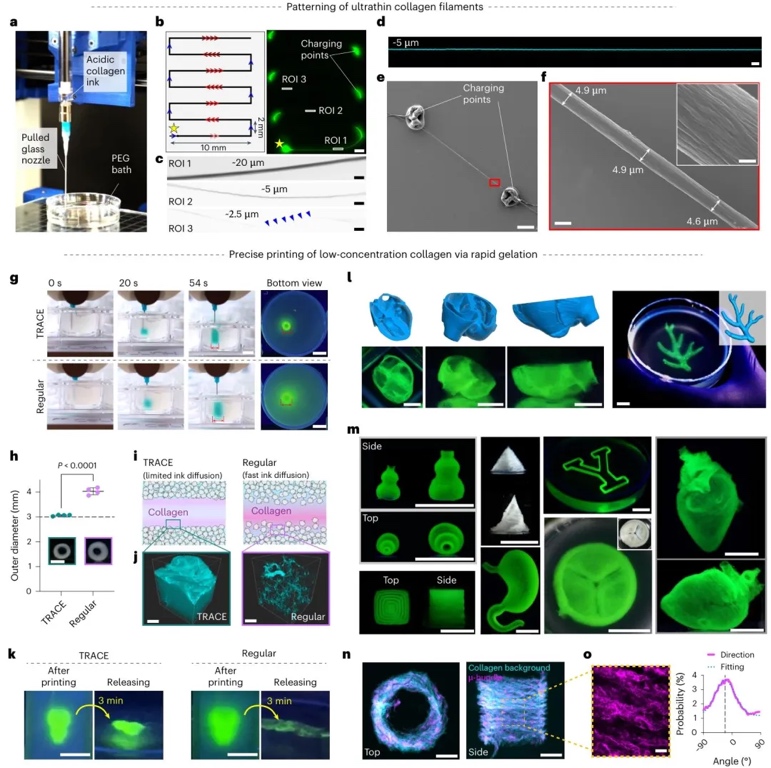 本研究开发的TRACE方法利用大分子拥挤效应实现了未修饰胶原蛋白的即时组装,能在广泛浓度范围内高通量创建从微米到宏观尺度的生理性胶原构建体。该方法通过调控多尺度结构线索促进细胞自组装与形态发生,且无需化学修饰或高浓度酸性条件,生物相容性高。基于此的生物打印技术可直接打印含活细胞的胶原生物墨水,构建具有结构复杂性和生物功能性的组织,如可收缩的心脏腔室、血管化组织及肠管等。研究拓展了未修饰胶原蛋白在多器官系统组织的可控多尺度生物制造范围,为再生医学中功能性细胞组织的工程化提供了新策略,相关成果为复杂组织的构建和器官再生研究奠定了基础。