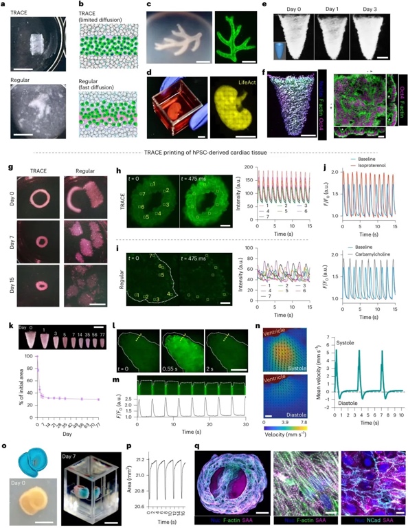 功能性组织打印:负载心肌细胞的胶原墨水可打印收缩性心室模型,表现出自发钙瞬变和药物响应,双心室结构实现同步收缩,泵血功能维持 77 天。