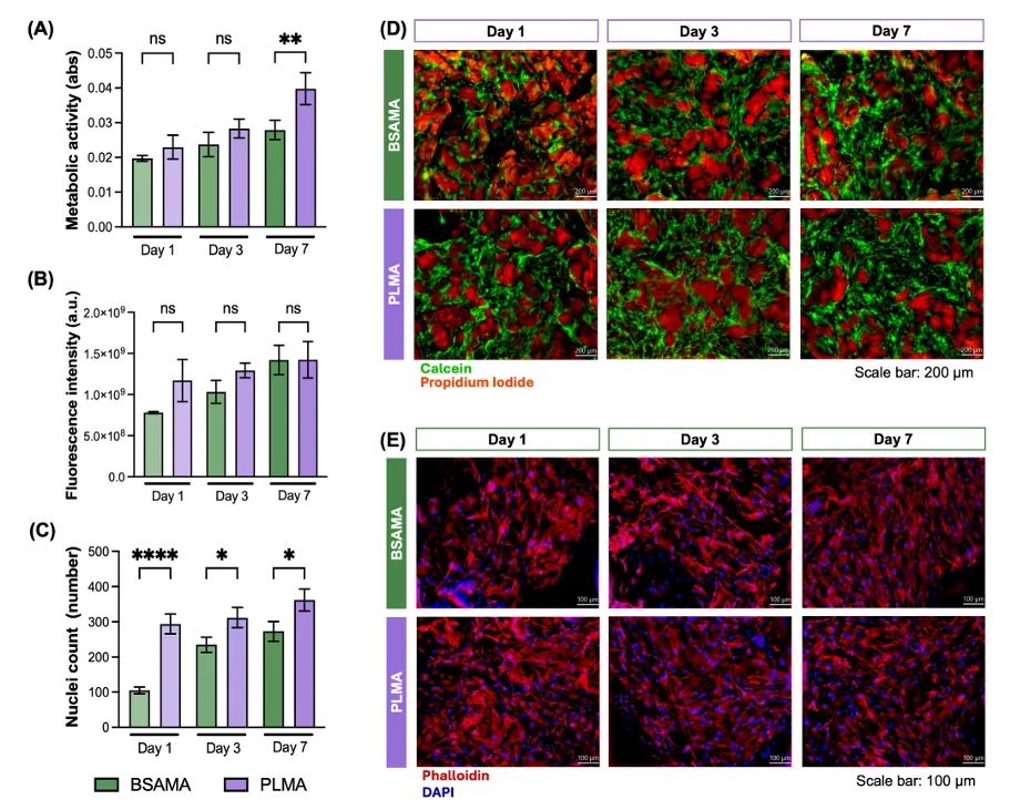 通过一系列细胞实验评估了PLMA和BSAMA基颗粒化支架的生物相容性和细胞增殖能力。结果显示,人类脂肪干细胞(hASCs)在两种支架上均能成功粘附和增殖,但PLMA基支架上的细胞代谢活性更高,细胞数量更多,且细胞形态更接近自然生长状态。这些结果表明PLMA基支架具有更好的细胞亲和力和生物学性能,为后续的生物打印和组织工程应用提供了有力支持。