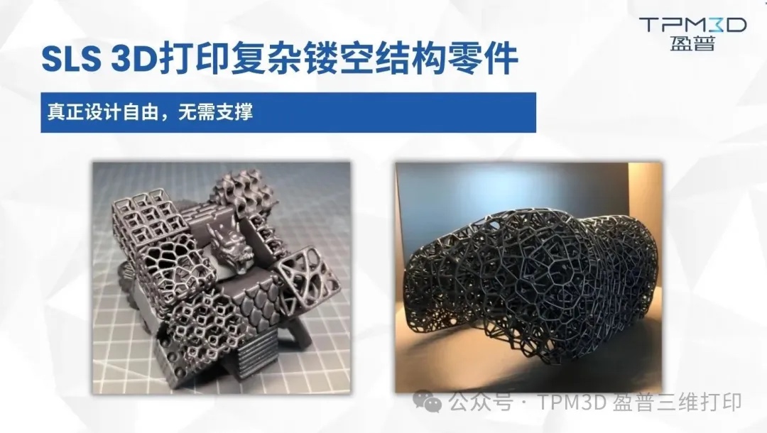 未烧结的粉末自然成为支撑,可轻松制造极其复杂的悬空、嵌套、中空结构(如内部流道、蜂窝状轻量化结构、复杂卡扣等),这是许多其他需要额外支撑结构的3D打印技术难以比拟的。