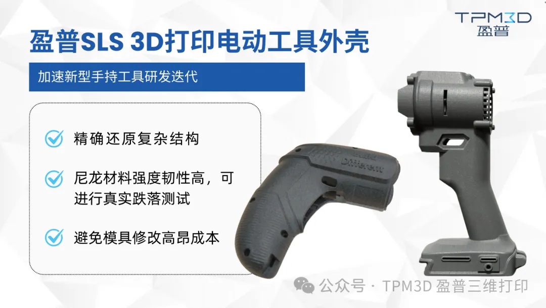 某电动工具厂商开发新型手持工具,外壳需集成复杂内部结构(散热风道、电池仓卡扣、防摔筋),且需承受一定冲击。盈普SLS打印的功能原型不仅精确还原了复杂结构,其尼龙材料的强度和韧性使得工程师能进行真实的跌落测试和握持感评估,快速优化结构设计,避免了后期模具修改的高昂成本。