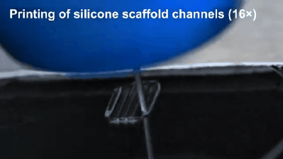 在这个项目中,研究人员采用了一台配备多个挤压头的定制3D打印机,用来制作硅胶支架。每个支架都包含微小的通道,旨在模拟脊髓的结构。