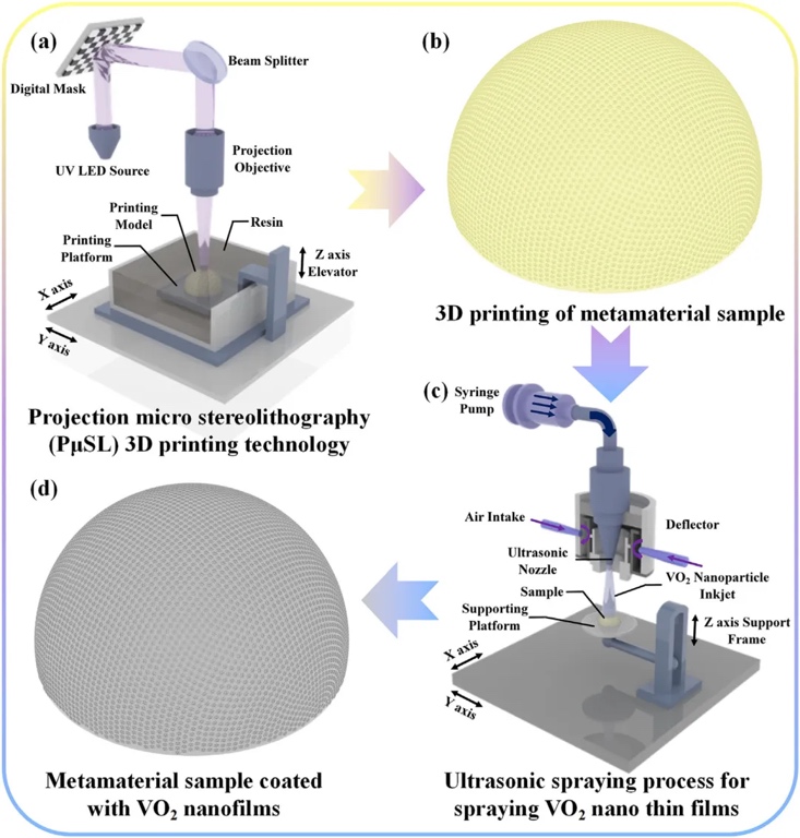 基于此,中国计量大学信息工程学院井绪峰教授和洪治研究员等人设计和实验制备了一种基于二氧化钒相变调控的花瓣状超材料吸波器,并利用摩方精密面投影微立体光刻(PμSL)技术与超声喷涂薄膜法结合的方法制备两款共形超材料样品。这两种方法的结合可以实现高精度复杂超材料样品的制备,对微纳领域可调谐超材料器件的研究提供了一定的帮助。研究成果以“3D
