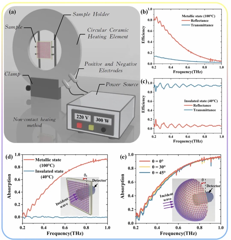 S230(精度:2μm)3D打印花瓣状超材料吸波器的流程以及超声喷涂法涂覆二氧化钒薄膜的制备流程。在该研究中,超材料样品使用的是光学精度2μm,层厚5μm的高精度低层厚的摩方精密面投影微立体光刻(PμSL)技术。在制备完成的超材料样品表面,使用超声波喷涂设备在室温下进行二氧化钒纳米墨水超声喷涂工艺。图3利用太赫兹时域光谱仪(THz-TDS)对制备样品进行了性能表征。在实验测试过程中,采用了一种特殊的加热方式——非接触式加热法。非接触式加热法是通过加热样品周围的空气,使得整个样品处于一个温度恒定的空间中,样品的温度可控、变化稳定且受热均匀。同时,加热装置不与样品接触,从而避免了其对样品测试性能的影响。