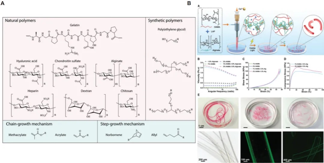 讨论了天然聚合物(如脱细胞细胞外基质、透明质酸和胶原蛋白)以及合成聚合物(如Pluronic F127和海藻酸盐)在生物墨水中的应用。