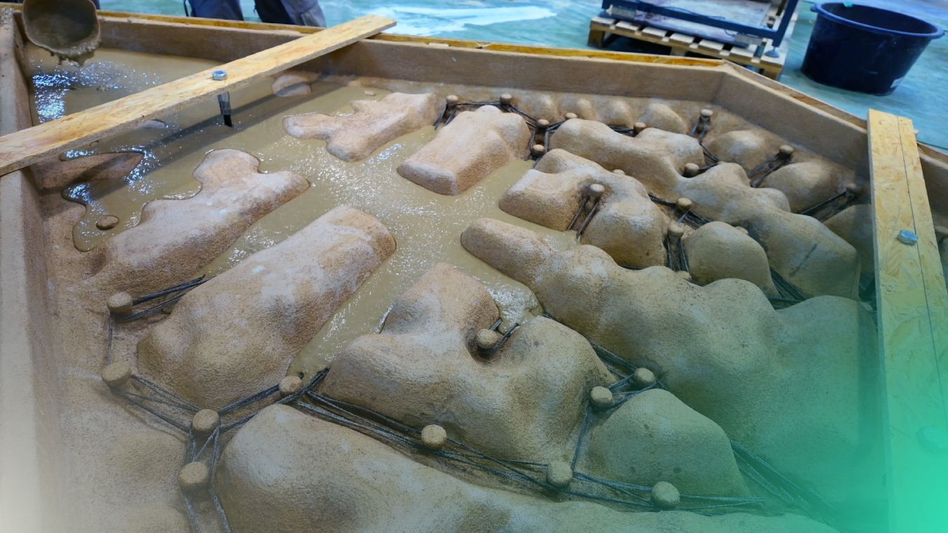 这套加固系统用亚麻纤维代替钢筋,并通过机器人以连续蜿蜒的路径将亚麻纤维铺设在复杂的模板几何形状内。钾活化土聚物砂浆作为混凝土的替代品,与亚麻纤维增强材料粘合。两家公司报告称,与传统方法相比,这种组合可以生产出更轻、更坚固的楼板。