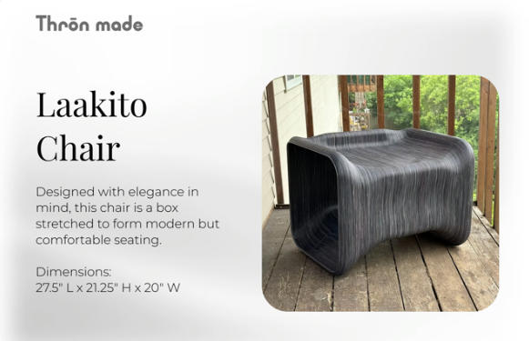 2025年9月15日,南极熊获悉,美国一家名为Thrōn的小型3D打印初创公司在众筹平台Kickstarter发起了一个新项目,推出一系列以可持续环保为核心理念的3D打印雕塑家具,并面向全球专业及消费级市场。团队使用植物基树脂打印家具,同时也提供混合回收材料的家具选择,这个项目旨在建设社区的同时提供环保解决方案。