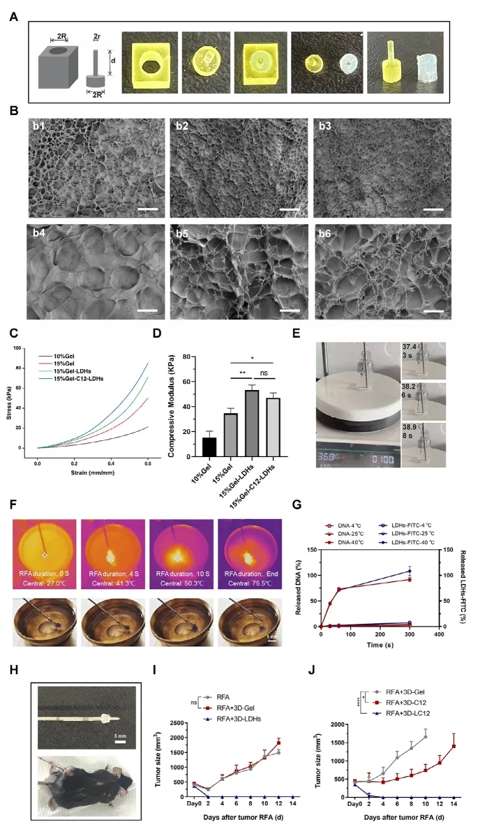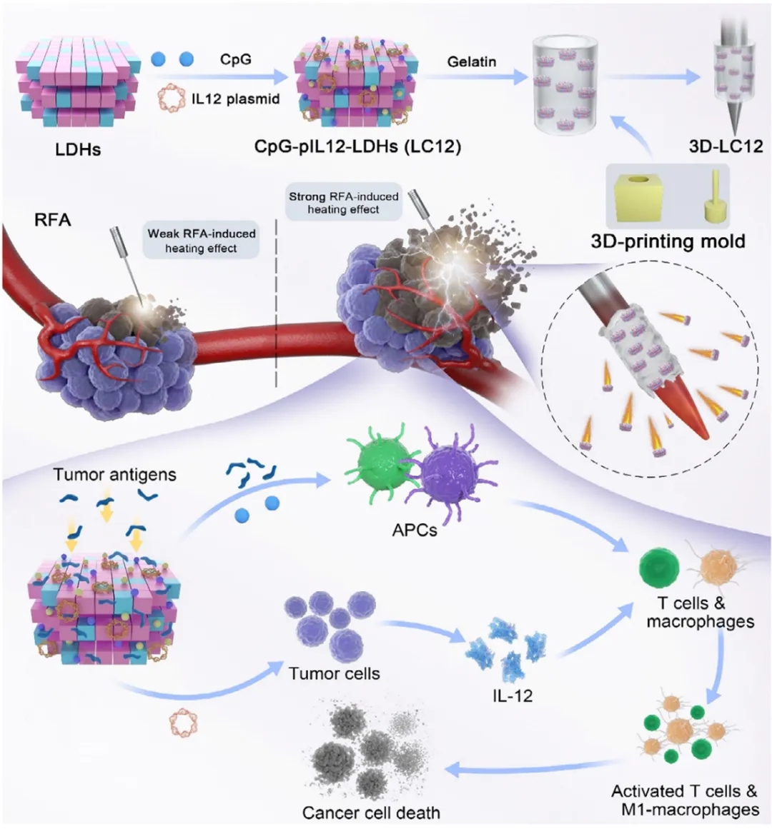 王凯团队设计的3D-LC12项圈,本质是一个新型的“智能药物递送+热效应增强”的多功能免疫治疗平台,其核心创新点在于将镁铝层状双氢氧化物(LDHs)纳米佐剂与免疫刺激物(CpG、IL-12)结合,并通过3D打印制成贴合肿瘤的“项圈”状载体。