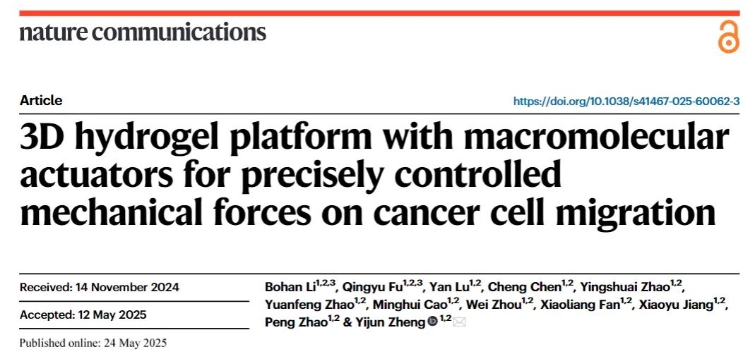 来自上海科技大学的郑宜君研究员团队开发了一种嵌入近红外响应大分子致动器的三维水凝胶平台,该平台能够对癌细胞中的特定整合素亚型进行精确的机械刺激。通过该系统,团队研究了不同力参数(大小、频率和持续时间)对卵巢癌细胞球迁移和侵袭的影响,为研究癌细胞机械转导提供了有力工具,并为开发靶向癌症治疗方法提供了潜在见解,相关工作以《3D