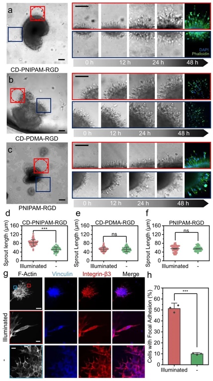 DexMA水凝胶平台的设计及其对癌细胞迁移的调控机制。结果表明,该平台利用近红外光照射使CD基团将光转化为热,促使温敏性PNIPAM链收缩并直接对细胞受体施加拉力,可通过不同配体(RGD和RTD)靶向整合素αvβ3和αvβ6,实现对癌细胞迁移的调控。