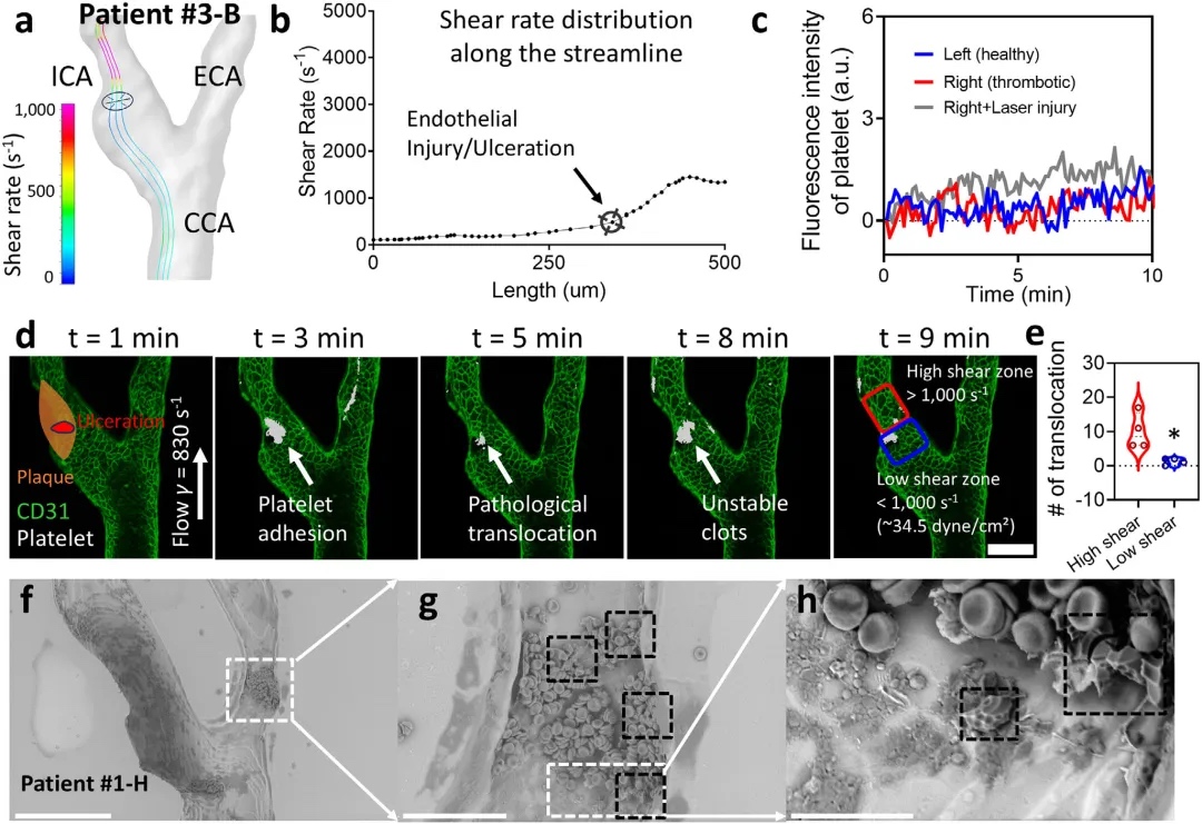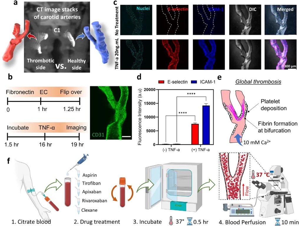 该制造平台不仅能够精准复制患者颈动脉的狭窄、分叉和溃疡等解剖特征,还支持内皮细胞培养和血流动力学模拟。通过计算流体力学验证,即使缩小30倍的芯片模型仍能保持与真实血管相似的血流剪切力分布,为血栓形成机制研究、药物筛选和个性化治疗方案制定提供了高度仿真的实验环境。此外,平台的标准化设计和模块化架构使其可扩展至冠状动脉、脑血管等多种血管疾病模型,满足了不同研究场景的需求。这项研究代表患者特异性器官芯片技术的重大进展,在个性化医疗和血管设备开发领域具有重要的应用价值,为研究剪切力依赖性血栓形成机制提供了新的工具。