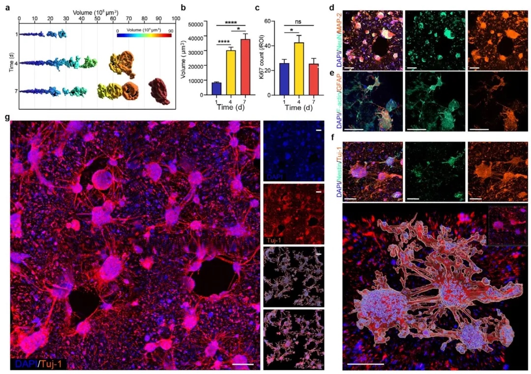 利用免疫荧光染色和3D重建技术,研究了3D neuMatrix中神经细胞的类型和连接情况。结果显示3D neuMatrix中主要是成熟的神经元,还有少量星形胶质细胞,这些神经细胞形成了局部和长距离的纤维连接,构成了复杂的神经网络。