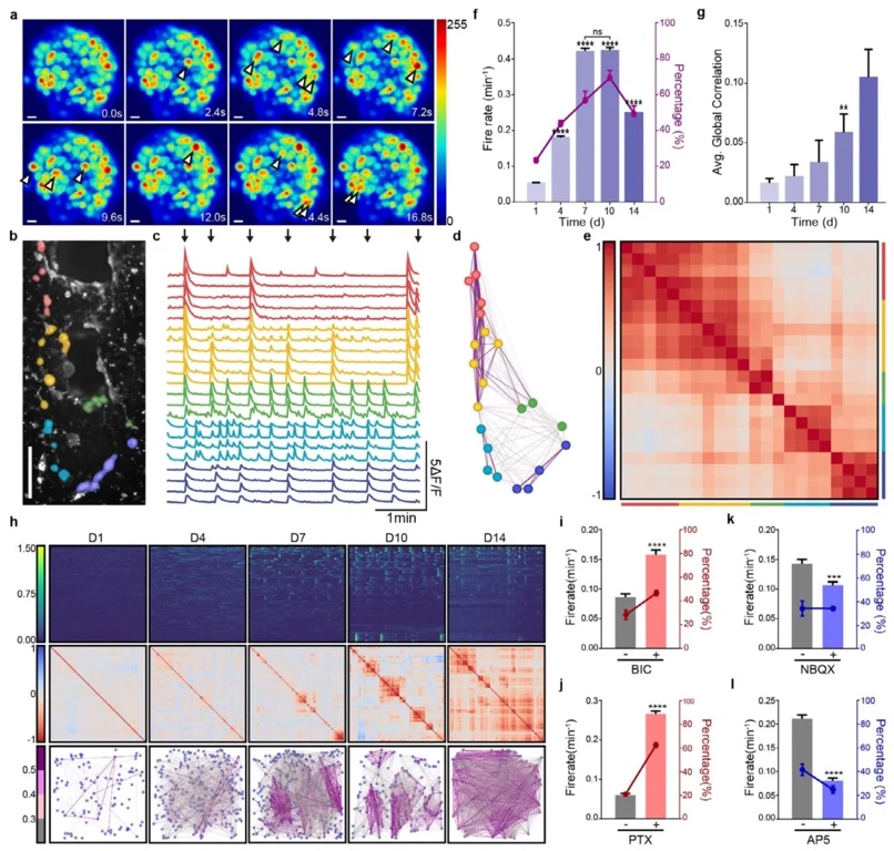 采用钙信号成像技术,观察3D neuMatrix中神经细胞的功能活动及对药物的反应。结果表明3D neuMatrix中的神经细胞存在自发的钙振荡,并且不同神经集群之间有同步的信号传递,使用不同的神经递质受体拮抗剂能调节神经细胞的放电频率和同步性。