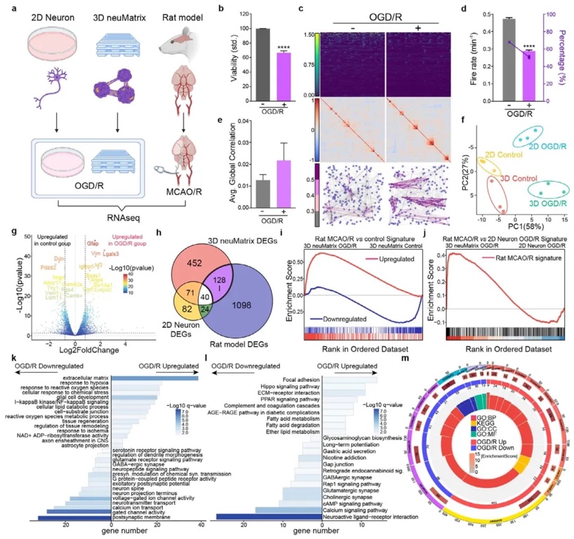neuMatrix在OGD/R处理后,细胞活力下降,神经功能受损,其转录组特征更接近大鼠MCAO/R模型,能更好地模拟缺血性中风的病理生理过程。