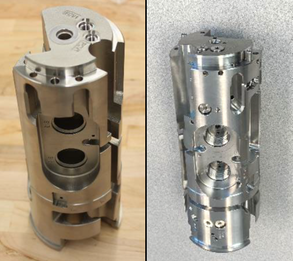 △左图为 Burloak 的 3D 打印液压歧管;右图为传统制造的等效产品。(图片来源:Kinectrics)
