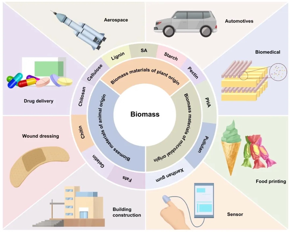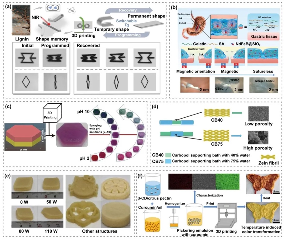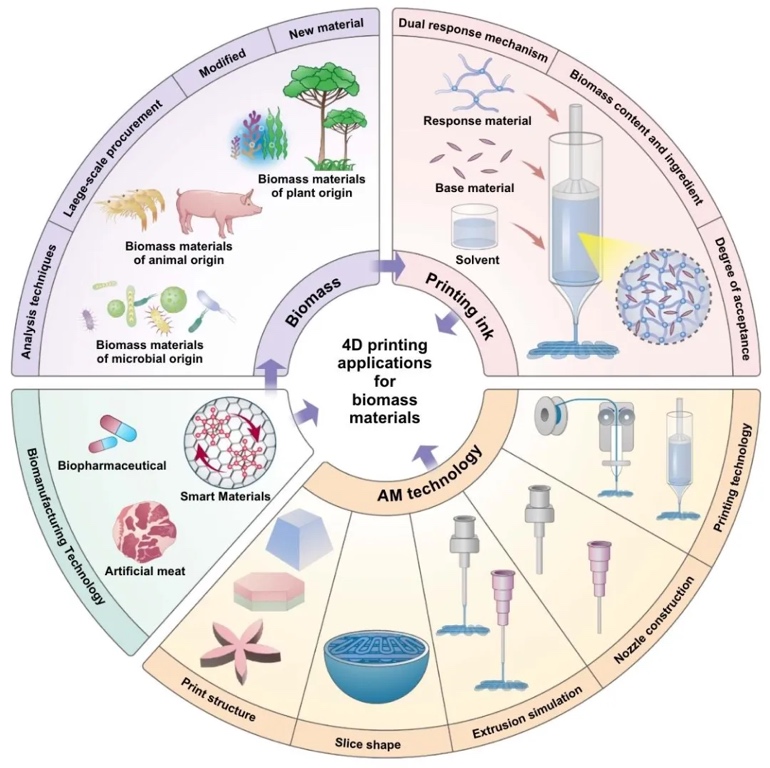 木质素复合材料、海藻酸钠、淀粉、植物蛋白、果胶等植物基生物质材料在4D打印中响应光、温度、pH等刺激,发生形状或颜色变化,用于软执行器、食品打印等领域。