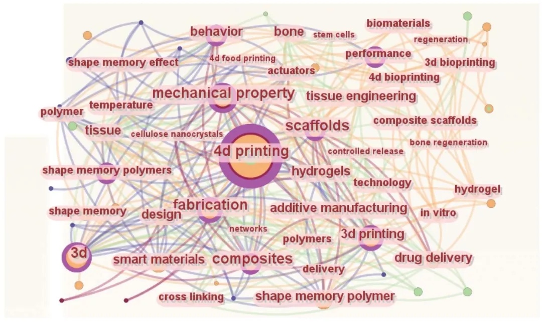 通过CiteSpace软件分析近五年4D打印相关天然材料的323篇文献,得到关键词共现网络,该网络有67个节点、316条连接线,聚类结构可靠。