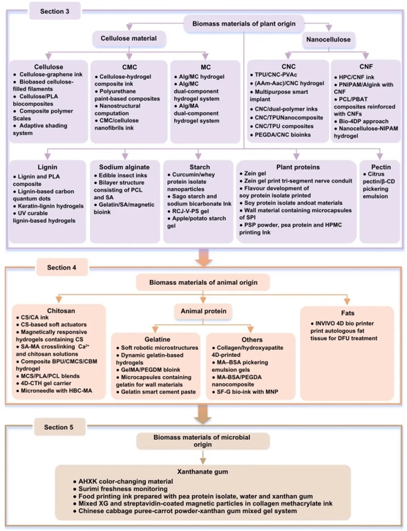 植物基、动物基、微生物基这三类生物质材料在3D打印中的应用领域,如植物基用于食品打印,动物基用于生物医学等。