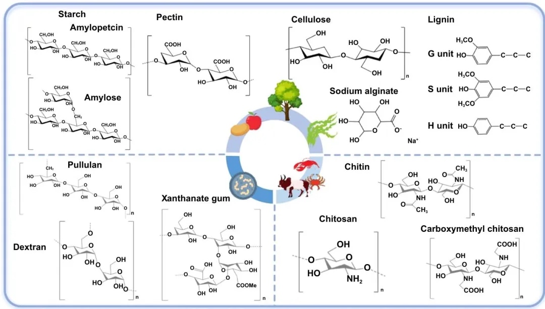 植物、动物、微生物基生物质材料的分子结构,如纤维素含羟基,壳聚糖含氨基和羧基,这些结构包含多种功能基团。