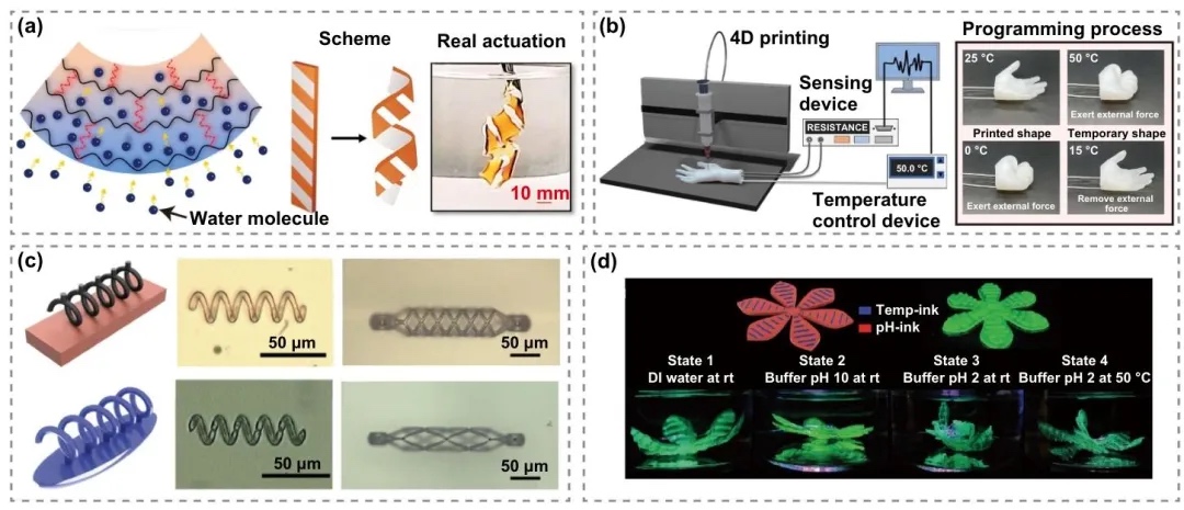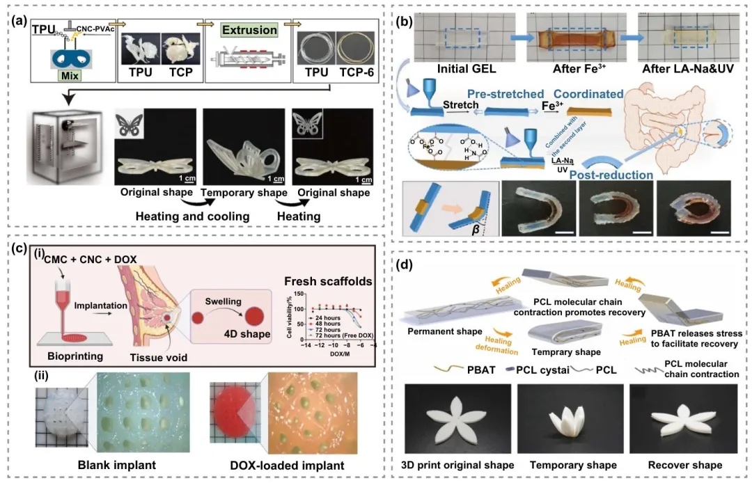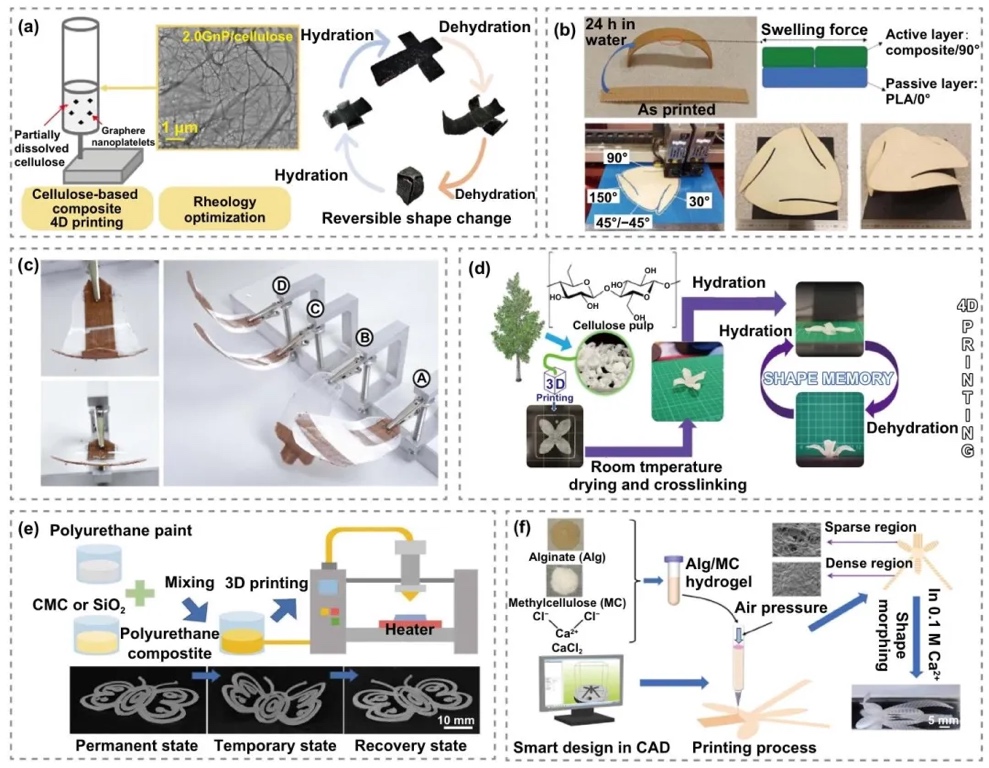 纳米纤维素(纤维素纳米晶体、纤维素纳米纤维)在4D打印中能增强材料机械性能和形状记忆特性,响应热、水等刺激,用于生物医学、软夹持器等领域。