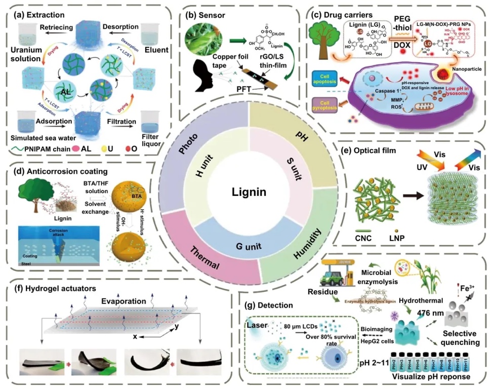 木质素基水凝胶在吸附、传感、药物载体等方面的应用,具有pH、温度、光等响应性,可用于铀吸附、呼吸传感器、药物缓释等。