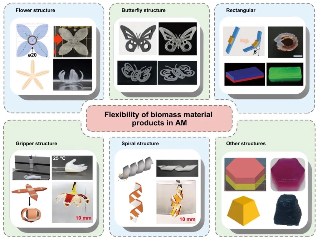 生物质材料打印的结构多样性,可打印花朵、蝴蝶、夹持器等结构,在刺激下发生弯曲、扭转等变形。