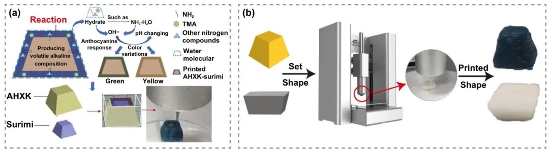 黄原胶等微生物基生物质材料在4D打印中通过pH、氨等刺激实现颜色变化,用于监测鱼糜等食品的新鲜度。