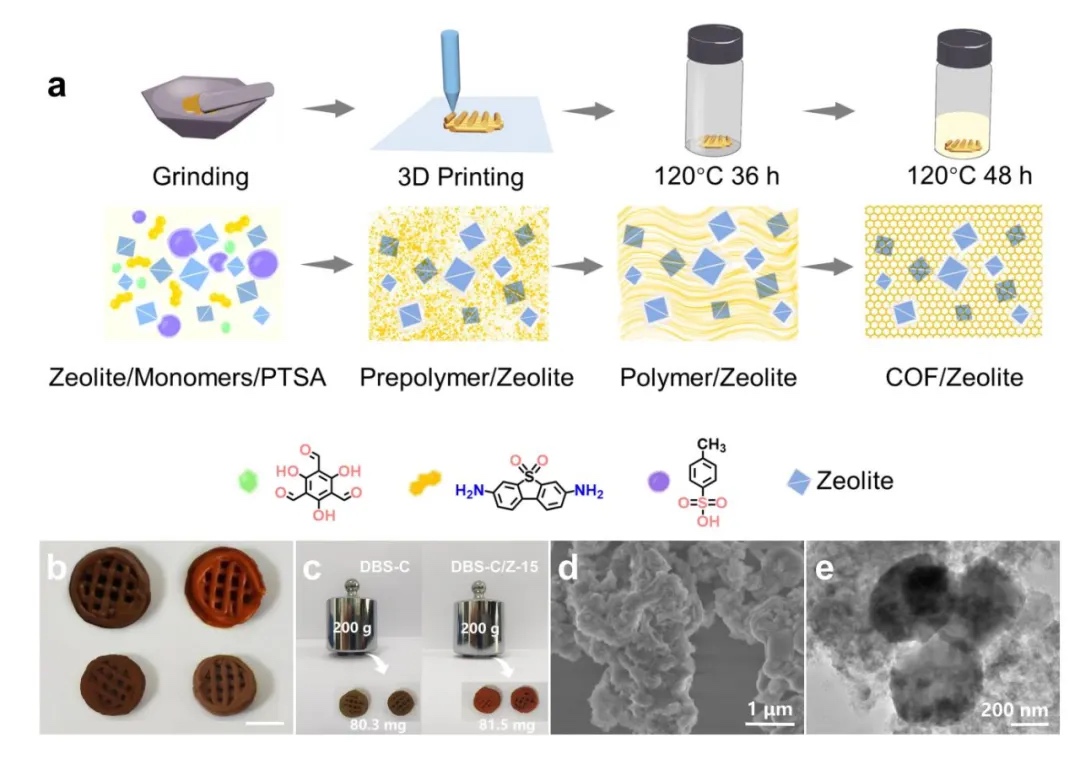 本研究开发了一种简便方法,制备出3D打印的共价有机框架(COFs)与沸石复合材料,作为极具潜力的光催化剂。研究深入分析了这些材料,弥合了单一多孔材料固有特性与其在3D打印杂化物中功能之间的差距。沸石成分具有有序纳米通道,亲水性强且对氧气亲和力显著,促进了物质向COFs活性位点的传输,从而生成过氧化氢。通过调节成分比例,本研究全面阐释了复合材料中的协同作用和光催化机制。结果显示,TP-DBS-COF/ZSM-5-45%的过氧化氢光催化速率比纯TP-DBS-COF提高了52%。这项研究展示了通过3D打印将COFs和沸石材料整合为均匀整体的优势,将推动COF/沸石复合催化剂在多种领域的进一步发展。