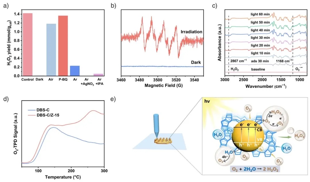 通过不同条件下的光催化测试、电子顺磁共振(EPR)、原位漫反射红外傅里叶变换光谱(DRIFTS)、程序升温脱附(TPD)等方法,研究了TP-DBS-COF/ZSM-5-15%复合材料光催化产H₂O₂的机制,结果表明该过程依赖光照和O₂,存在氧还原反应路径,沸石的加入增强了材料对O₂的吸附和亲水性,促进了电荷分离,从而提高了光催化效率。