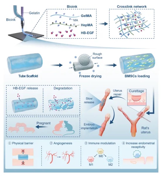浙江大学贺永教授团队采用同轴3D打印技术开发了一种新型生物活性支架。该支架由明胶甲基丙烯酰(GelMA)-肝素甲基丙烯酰(HepMA)生物墨水构成,可通过静电作用结合肝素样表皮生长因子(HB-EGF)实现其可控释放。这一独特设计兼具双重功能:作为物理屏障预防损伤后粘连形成,同时作为生物活性递送系统通过促进新生血管化实现子宫内膜再生。研究进一步整合了骨髓间充质干细胞(BMSCs),通过将巨噬细胞极化为抗炎M2表型来调控局部免疫微环境。动物实验表明,该联合疗法能成功恢复子宫内膜容受性(表现为雌激素受体α(ERα)和孕激素受体(PR)表达恢复),最终在子宫损伤模型中实现妊娠成功。全面安全性评估证实了该疗法的治疗潜力。这种多功能支架通过同步解决子宫内膜修复的结构性、再生性和免疫性障碍,为宫腔粘连治疗提供了具有前景的新策略。相关工作以“Coaxial