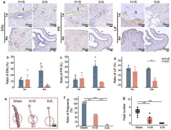 H+B联合治疗在子宫内膜修复中优于单一疗法,显著改善内膜厚度、腺体再生、纤维化抑制、血管生成及免疫调节。与IUA组相比,H+B组4周后完全恢复腺体结构,ERα和PR表达显著提升,而IUA组仍受纤维化抑制。白血病抑制因子(LIF)在H+B组正常定位于腔上皮,而IUA组则异常沉积于纤维束,影响胚胎着床。妊娠实验证实H+B组成功恢复子宫功能,实现胚胎植入。长期观察显示H+B组子宫结构完全修复,且无全身毒性,证明其安全有效。