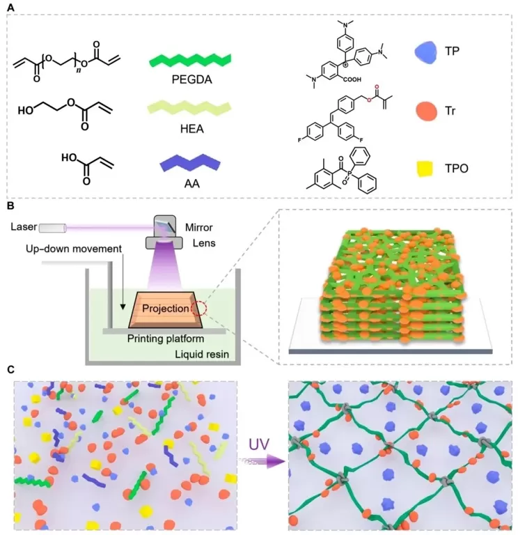 1. 材料制备阶段:开发多刺激响应墨水,结合数字光处理3D打印技术,制备出具有形状记忆、光致变色和热致变色行为的复杂3D结构。