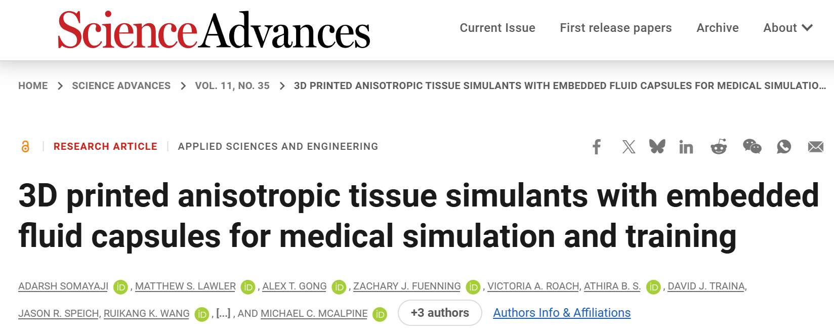 2025年10月15日,明尼苏达大学和华盛顿大学的研究人员开发了一种 3D 打印方法,可以复制人体组织的方向力学,为医学模拟和外科手术训练带来更高的真实感。相关研究以题为“3D