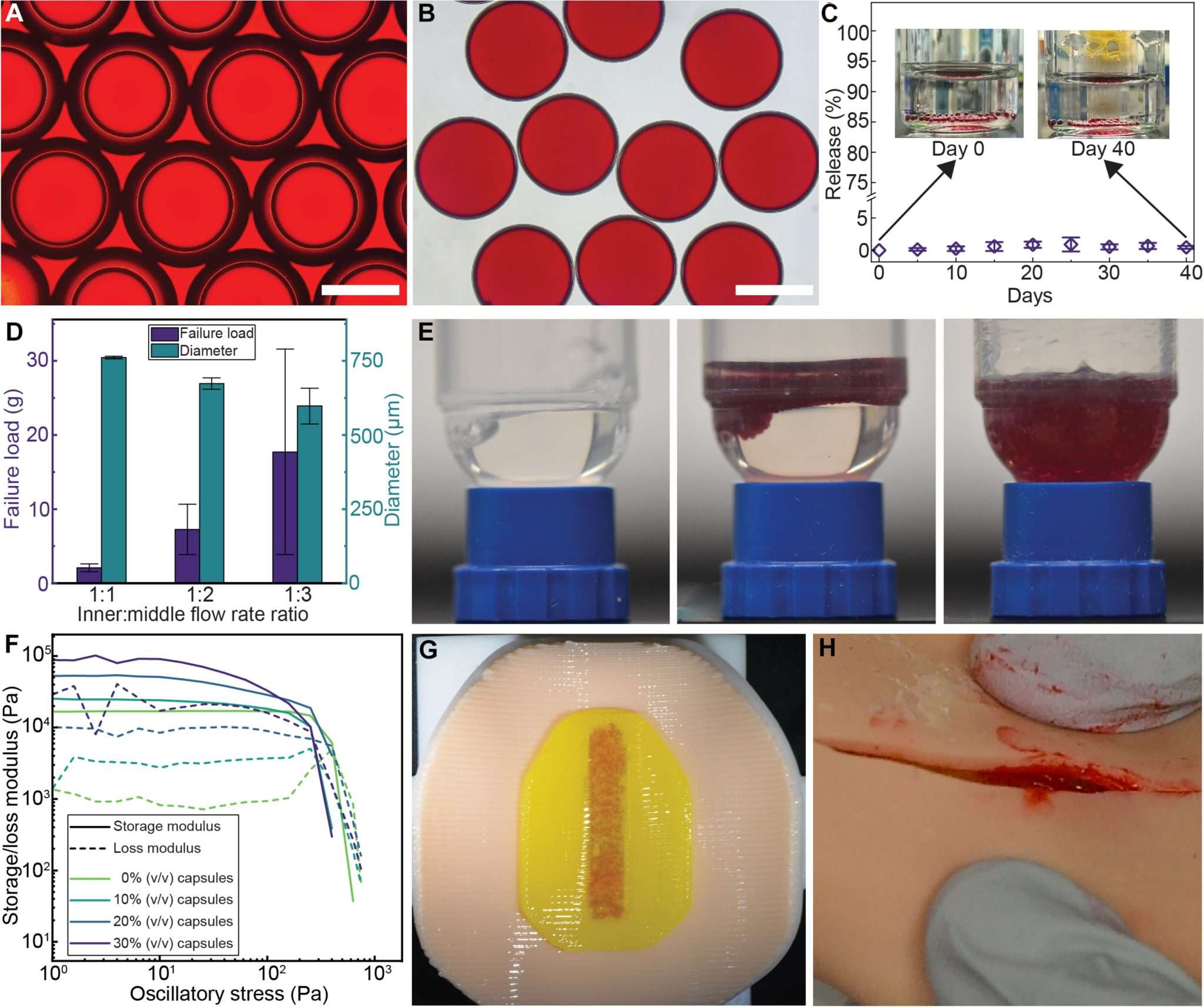 为了进一步增强真实感,研究人员将充满液体的微胶囊集成到打印的组织中,以重现切割时的出血现象。这些胶囊采用微流体双乳液工艺制造,将水性红色染料封装在一层薄薄的聚苯乙烯外壳内。将胶囊与剪切稀化水凝胶混合,沉积在打印的皮肤和皮下层之间,然后密封。当胶囊被压缩或切开时,胶囊会破裂并释放出有色液体,模拟血液流动。胶囊可保持数周稳定,不会发生泄漏,并且可以通过在制造过程中调整流速来调整尺寸和破裂强度。