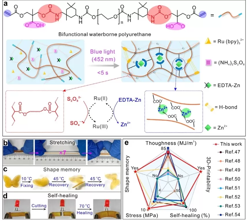 通过VSMC策略设计DCWPU,通过合成含乙烯基和羧基的双功能WPU,将其与EDTA-Zn、Ru(II)、APS混合形成前驱体,再经452nm可见光照射引发反应的研究方法,研究了VSMC策略制备DCWPU的原理及材料性能。结果表明,该策略可使EDTA-Zn在光照下释放Zn²⁺并与聚氨酯羧基配位,同时引发乙烯基自由基聚合,制备出的DCWPU应力、应变和韧性显著提升,且具有良好的形状记忆、自愈合性能和3D可打印性。