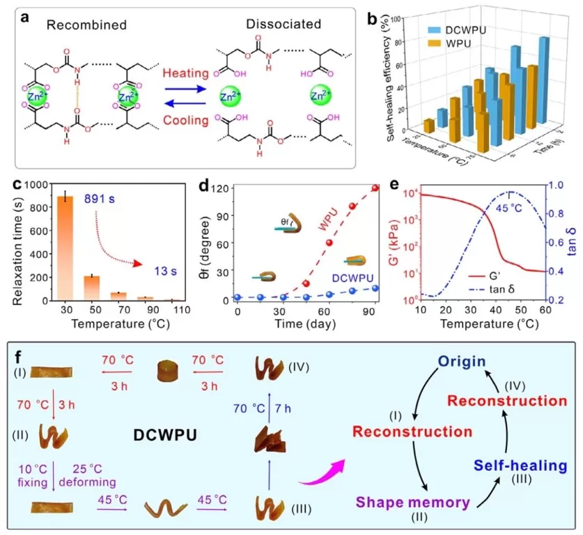 配体配位在高温下解离,低温下重组,使DCWPU具有自愈合、形状重构和形状记忆性能;随着温度升高,DCWPU的应力松弛加快,分子链重排加速,玻璃化转变温度约为45°C,在该温度附近材料的力学性能发生显著变化,展现出良好的形状记忆效果。