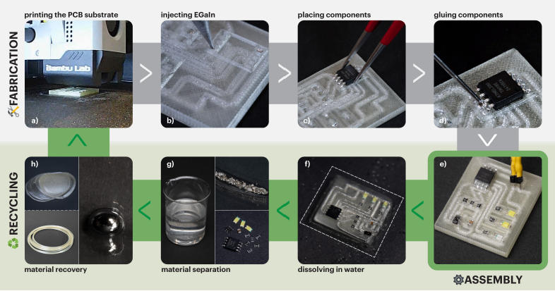 这种可回收电路板采用一种名为聚乙烯醇(PVA)的水溶性合成聚合物作为基材,并采用一种名为镓铟合金(EGaIn)的液态金属合金作为导体材料。电路板报废后,PVA会溶解于水中,而EGaIn材料则会聚集形成可重复使用的液态金属珠,便于回收并用于制造新的电路板。在初步测试中,由马里兰大学牵头的多机构合作团队发现,此种方法实现了98%的材料回收率。
