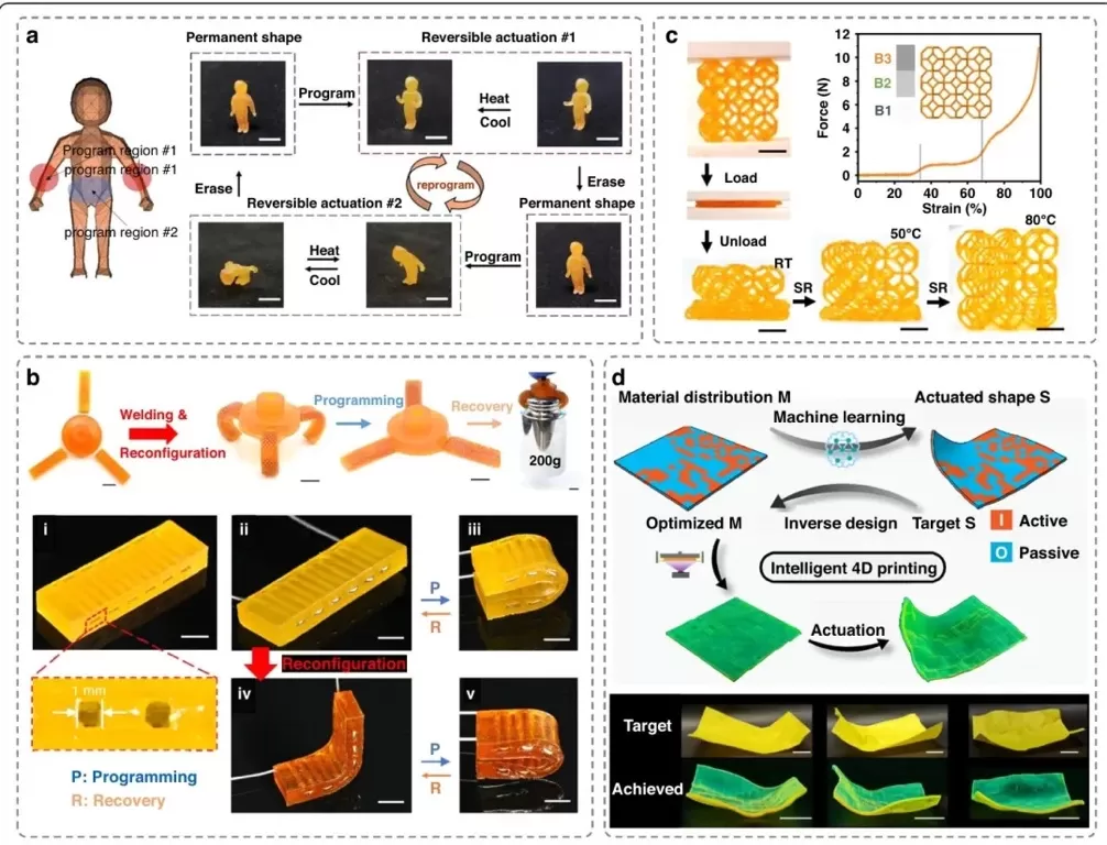 运用双晶相设计、共价适应性网络(CANs)及机器学习逆向设计等方法,研究SMPs执行器的多形状可编程性。通过引入LCEs-SMPs复合体系,实现快速可逆形变与高刚度保持;利用CANs网络,开发出可焊接的4D打印智能夹具,支持多永久形状重构;通过冷编程技术,在室温下利用应力松弛效应实现形状设定。结果表明,机器学习算法可精准优化活性材料(SMPs)与被动材料的分布,预测执行器形变路径,误差低于5%。