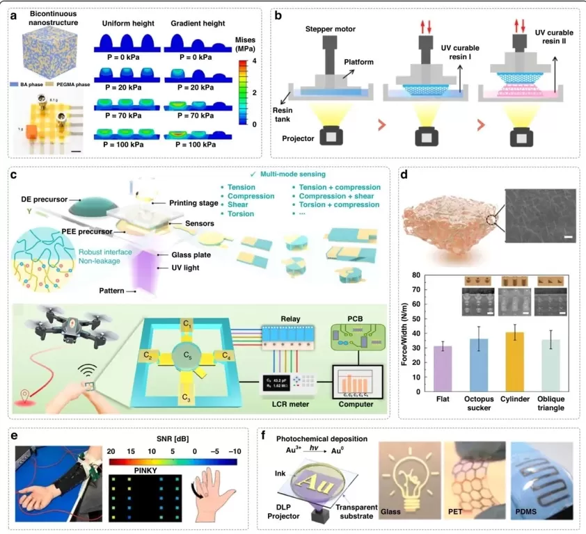 μm)、快速打印(优于逐点固化的SLA)和多材料兼容性,显著提升了柔性器件的结构复杂度与功能集成度。