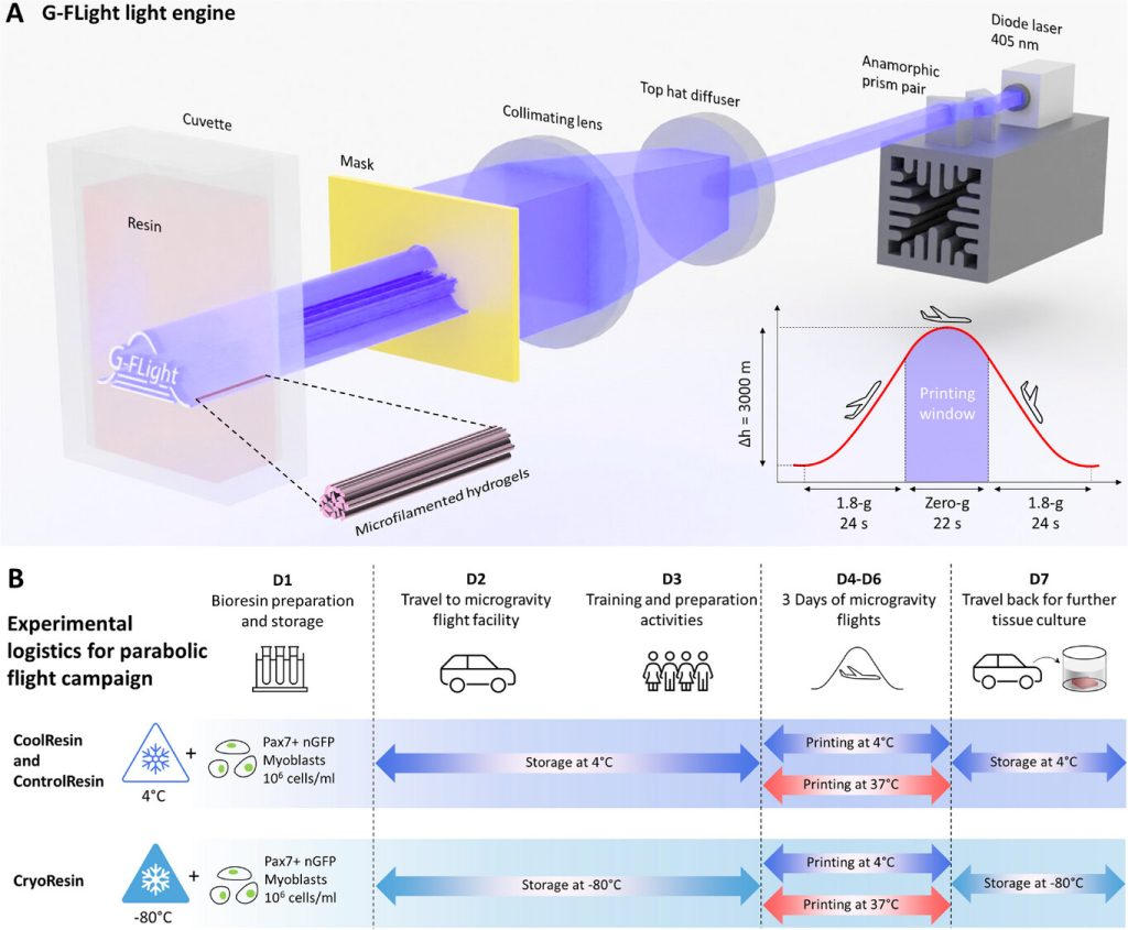 在太空失重条件下,宇航员常常面临严重的生理衰退,尤其是肌肉萎缩。为深入研究和减缓这一现象,ETH Zurich团队开发了名为“G-Flight(Gravity-independent filament light)”的先进生物制造系统。这种新型系统能够在微重力环境下,于数秒内高效构建出具有活性的肌肉组织。研究人员采用特殊配方的生物树脂,在为期30个抛物线飞行周期的失重阶段完成了3D打印实验。
