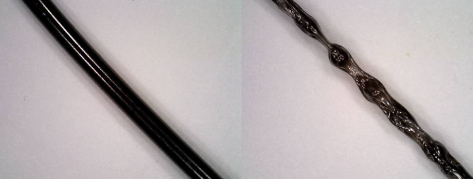 △显微照片显示了光滑的层状 ABS 挤出物与熔体断裂,当剪切速率超过材料的粘度和弹性极限时,就会发生这种断裂。