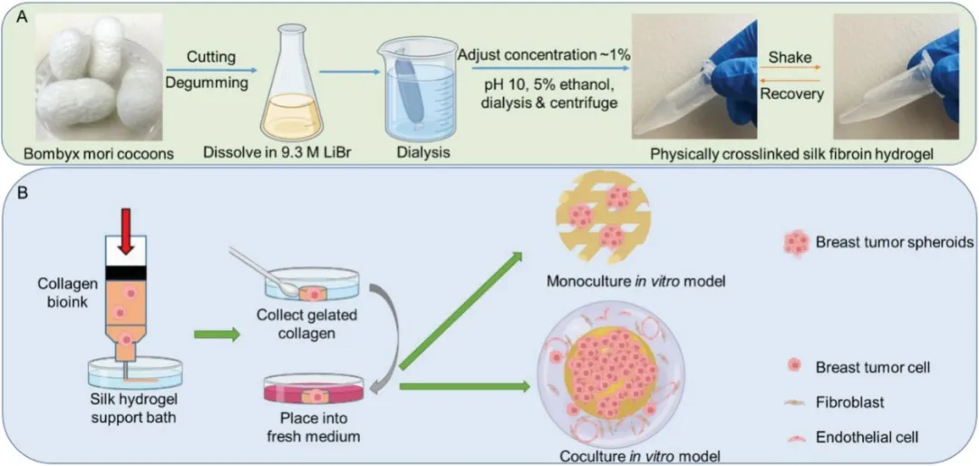 生物墨水。该生物墨水被优化用于嵌入式3D生物打印,适用于乳腺癌细胞和癌症相关成纤维细胞(CAFs)。研究还使用生物相容且物理交联的丝蛋白水凝胶作为支撑浴,用于嵌入式3D打印,以支持低粘度胶原生物墨水的打印。