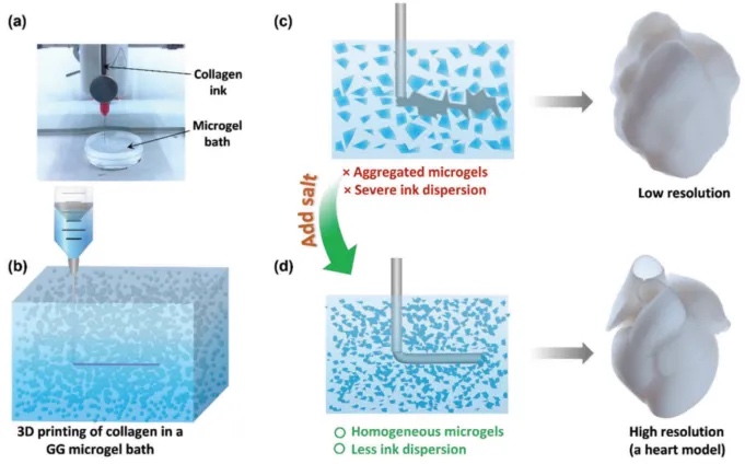 GG)微凝胶浴来实现高分辨率的3D打印。通过引入柠檬酸三钠(TSC)到GG微凝胶浴中,抑制了微凝胶的聚集,形成了均匀的浴形态,并通过TSC的脱水效应抑制了胶原墨水在浴中的扩散。这种设计有效地提高了打印的分辨率。