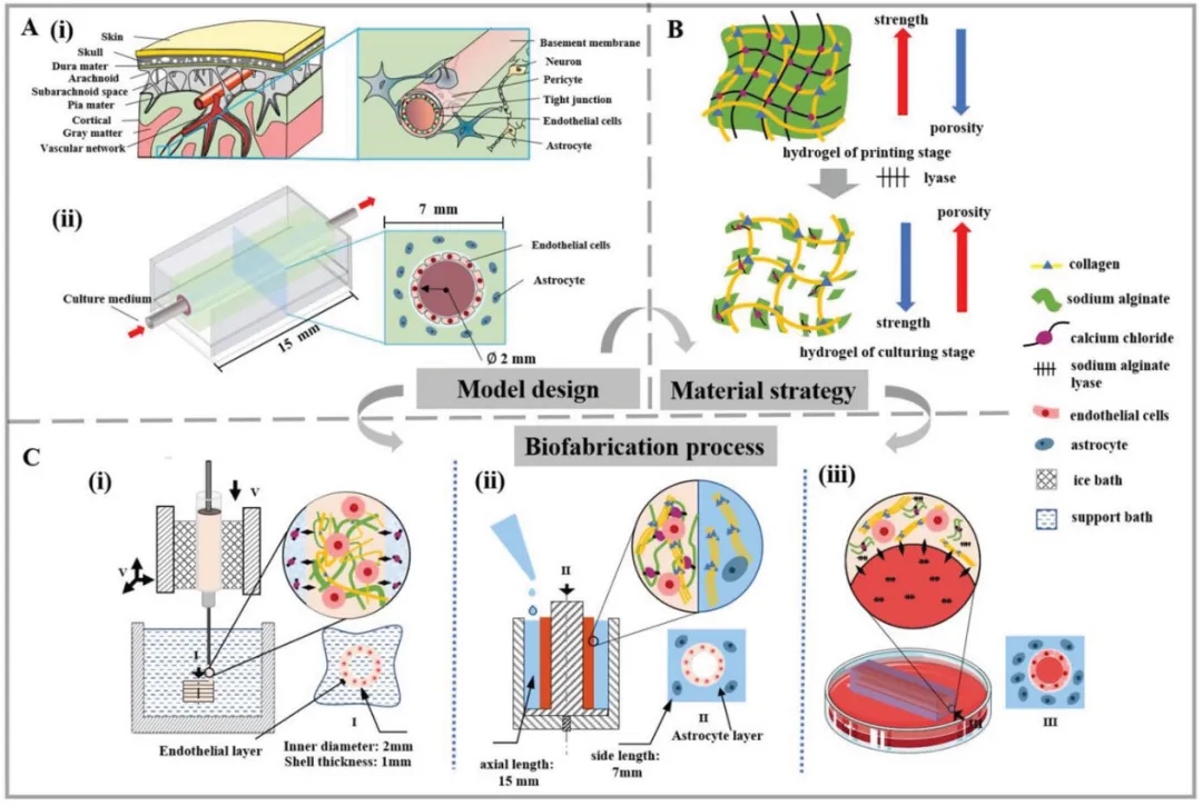 材料设计:设计了一种低粘度的海藻酸钠/胶原复合生物墨水用于神经血管组织的3D打印。生物墨水由海藻酸钠和胶原组成,通过在打印过程中使用CaCl2进行瞬时交联,以增强其粘弹性和稳定性;在培养阶段,通过添加海藻酸裂解酶(alginate